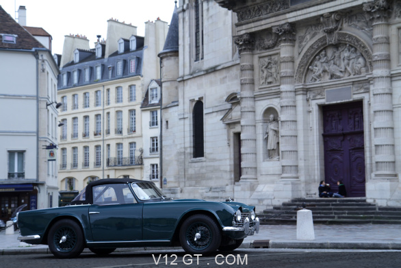 Accueil V12 GT / Les plus belles photos de GT et de Classic. / Classic Driver / Traversée de Paris 2012 / Traversée de Paris 2012 - Triumph TR6 vert 3/4 avant droit
