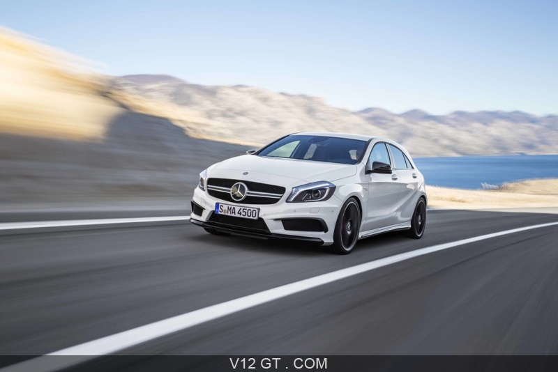 Accueil V12 GT / Les plus belles photos de GT et de Classic. / Photos GT / AMG / Mercedes A45 AMG blanc 3/4 avant gauche travelling penché
