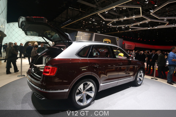 Accueil V12 GT / Les plus belles photos de GT et de Classic. / Photos Salons / Genève 2018 / Salon de Genève 2018 - Bentley Bentayga Hybrid marron/gris 3/4 arrière droit coffre ouvert