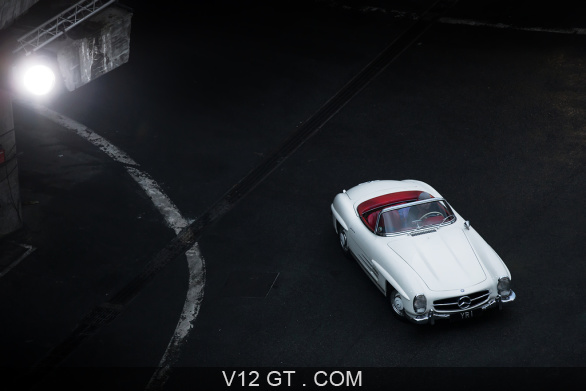 Accueil V12 GT / Les plus belles photos de GT et de Classic. / Photos Salons / Rétromobile 2018 / Rétromobile 2018 - Mercedes 300 SL Roadster blanc 3/4 avant droit vue de haut