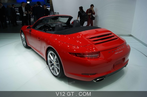 Accueil V12 GT / Les plus belles photos de GT et de Classic. / Photos Salons / Salon de Detroit 2012 / Salon de Detroit 2012 - Porsche 991 Carrera Cabriolet rouge 3/4 arrière gauche