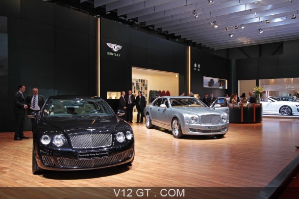 Accueil V12 GT / Les plus belles photos de GT et de Classic. / Photos Salons / Salon de Genève 2011 / Bentley Continental Flying Spur Series 51 noir face avant & Mulsanne gris 3/4 avant droit